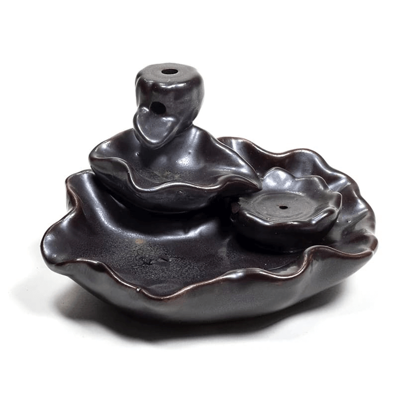 Rückfluss Wasserfall Weihrauchbrenner Lotus Teich ist ein dekorativer Halter für passende Rückfluss Räucherkegel. Beim Abbrennen steigt der Rauch nicht nach oben sondern fließt kontrolliert nach unten und erzeugt einen sichtbaren Wasserfall Verlauf der die Form der Schalen optisch betont. Zusätzlich eignet sich der Brenner zum Abbrennen dünner Räucherstäbchen.